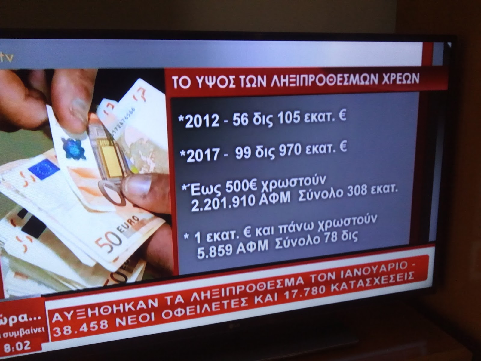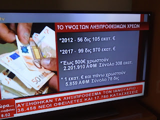 Όπως παρουσίασε η εκπομπή "Συμβαίνει Τώρα" 1.744.115 φορολογούμενοι (το 40%) κινδυνεύουν με αναγκαστικά μέτρα είσπραξης, ενώ 4.107.314 φορολογούμενοι έχουν ληξιπρόθεσμα χρέη προς το Δημόσιο.
