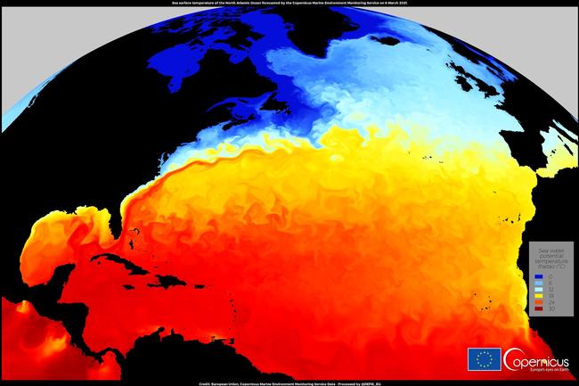 Η θερμοκρασία της επιφάνειας της θάλασσας είναι μια θεμελιώδης φυσική μεταβλητή που χρησιμοποιείται για την κατανόηση, τον ποσοτικό προσδιορισμό και την πρόβλεψη των πολύπλοκων αλληλεπιδράσεων μεταξύ του ωκεανού και της ατμόσφαιρας. Η εικόνα του άρθρου απεικονίζει τη θερμοκρασία της επιφάνειας της θάλασσας του Βόρειου Ατλαντικού Ωκεανού όπως προβλέφθηκε από την Υπηρεσία Παρακολούθησης Θαλάσσιου Περιβάλλοντος του ευρωπαϊκού προγράμματος τηλεπισκόπησης Copernicus, για την 8η Μαρτίου 2021.